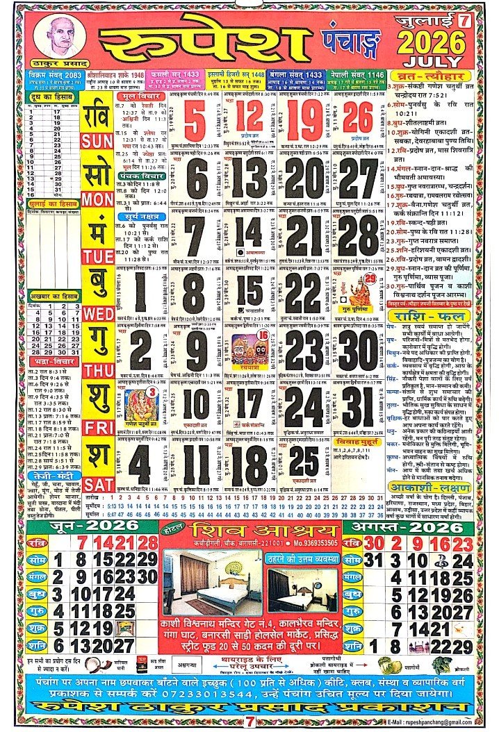 Welcome! You are on the most trusted page for the Thakur Prasad Calendar July 2026. July 2026 is a month of grand processions, sacred fasts, and the beginning of the holy Chaturmas period. If you’re looking for the official Varanasi-based Thakur Prasad Panchang details—including festival dates, Ekadashi, bank holidays, and auspicious marriage muhurat—you’ve found the right place.